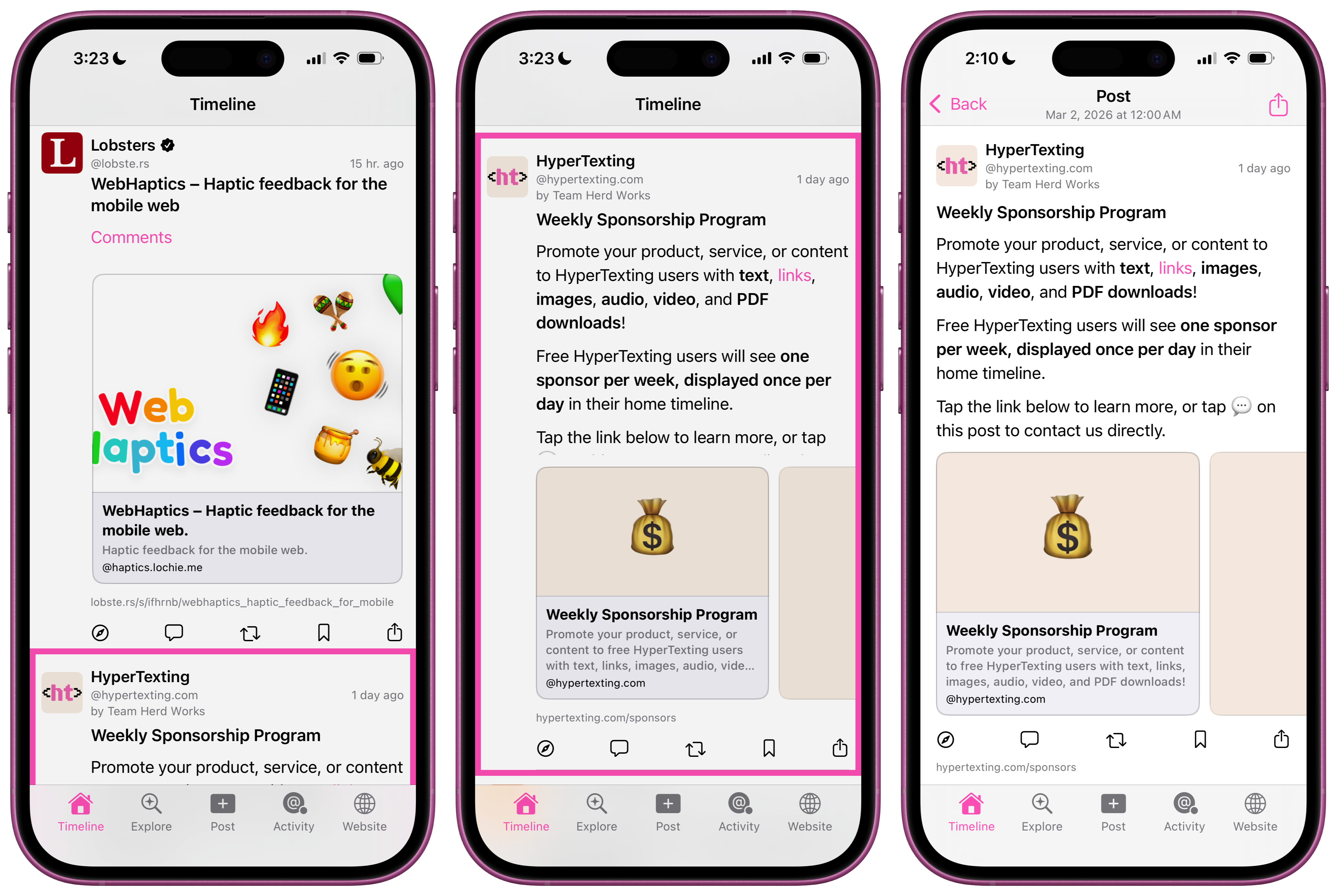 Sponsorsored posts appear in users' HyperTexting home timelines once per day.